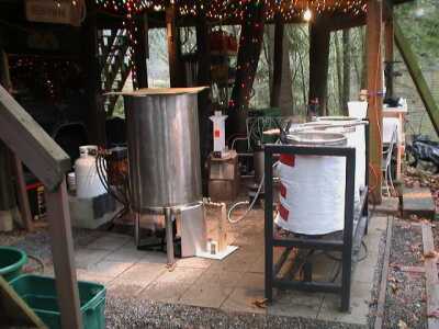 The general area. Fat Bastard kettle is in center and can hold approximately 55 gallons. The three smaller kettles to the right are used for mashing and have a capacity of 15.5 gallons each. Temperature for the mash kettles is maintained via fiberglass insulation and 3 propane burners. |