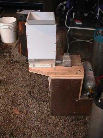 The grinder. Powered by 1/4 horsepower motor enclosed in base connected to 15:1 reduction gearbox. It can grind (crush, actually) about 120 lbs. per hour. |