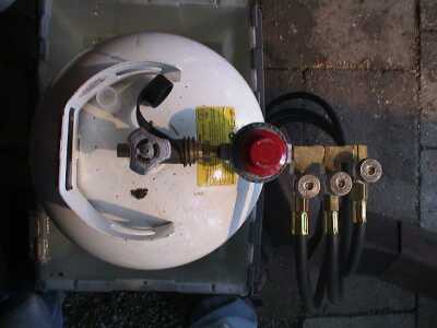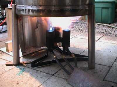 The triple burner running full blast under the Fat Bastard. 450,000 total Btu! Can heat 32 gallons of water 125 degrees in 50 minutes. |